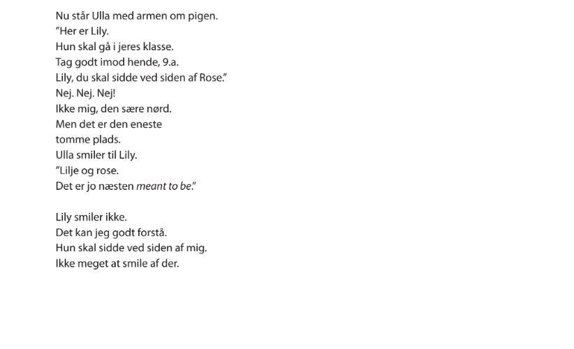 Lily er ny i 9.a. Hun skal sidde ved siden af Rose. Rose håber på at blive venner med Lily. Men Lily har andet at tænke på. Hun er bange hver eneste dag. Bange for, hvad der kan ske derhjemme.